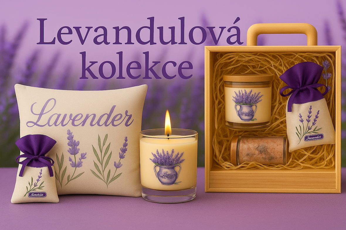 Luxusní dárková kazeta s levandulovými produkty – sójová svíčka, koupelová sůl a voňavý pytlíček. Ideální dárek pro chvíle klidu a odpočinku.