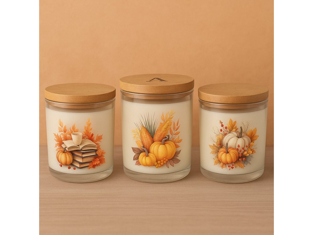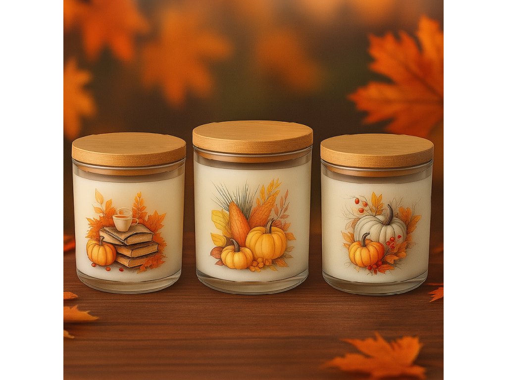 Podzimní sójová svíčka ve skle o objemu 200 ml s motivem dýní a podzimní sklizně. Obsahuje 170 g přírodního sójového vosku a hoří až 30 hodin. Originální dekorace i voňavý společník pro chladné večery.