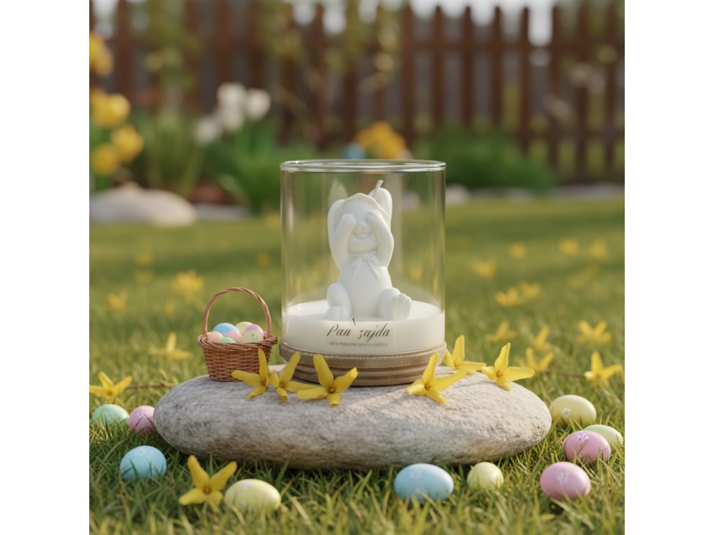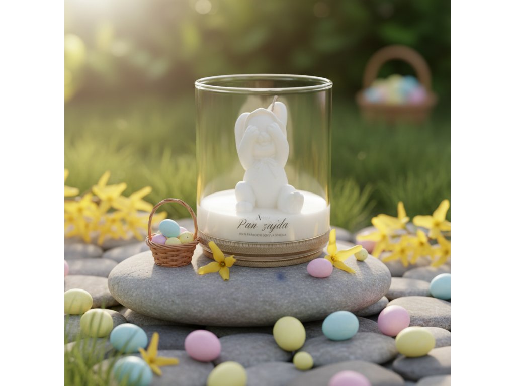 Pan Zajda - Roztomilý zajíček, který si zakrývá oči, rozjasní každou jarní dekoraci i dětský úsměv. 100% přírodní sójová svíčka s vůní a vtipem.