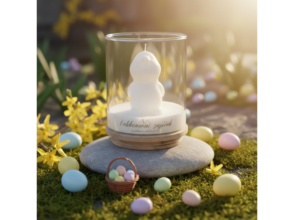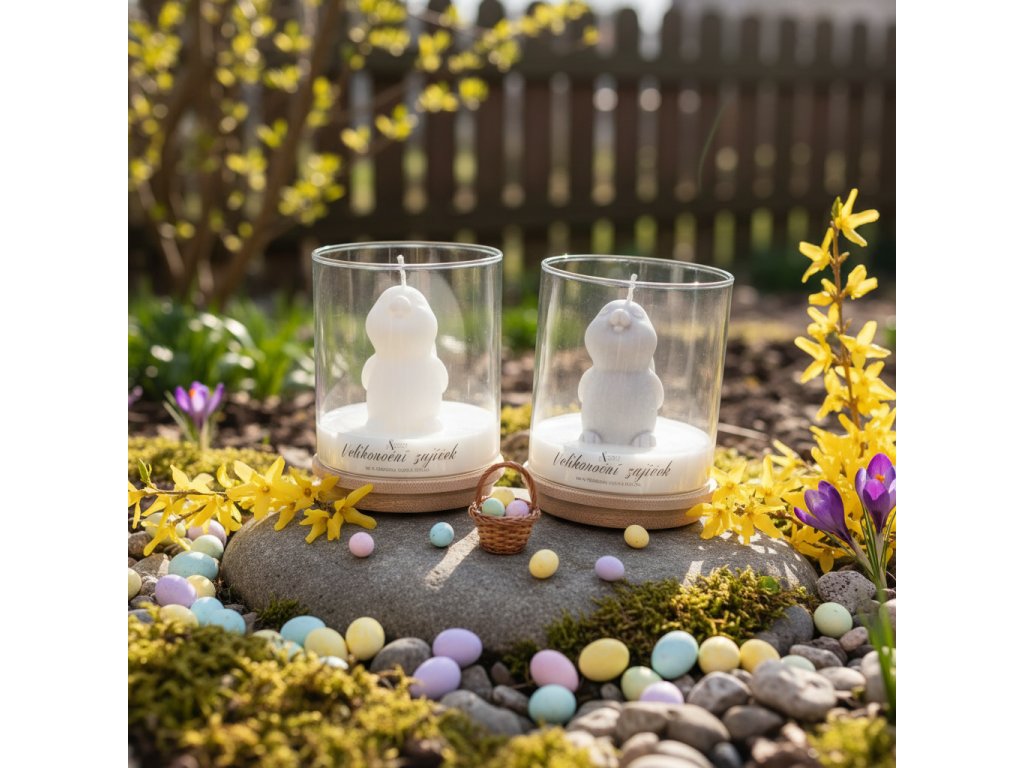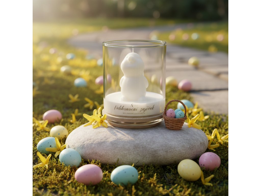 Velikonoční zajíček - jarní dekorativní svíčka ve skle s roztomilým zajíčkem z přírodního sójového vosku. Ruční výroba, něžný vzhled i vůně.